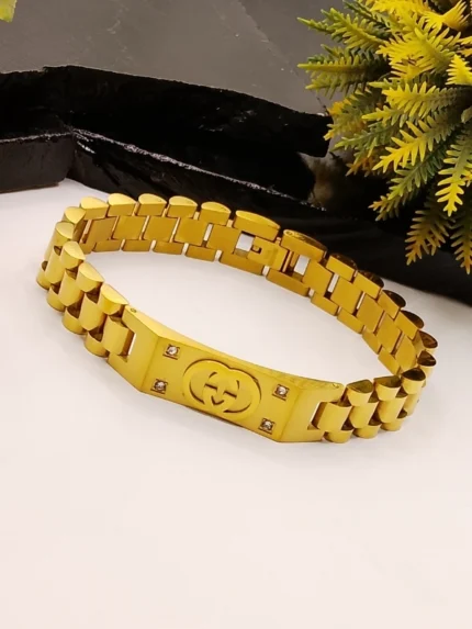 Gold Gucci Style Logo Stainless Steel Bracelet for Men with CZ Stones