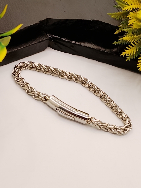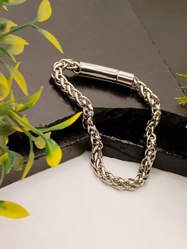 The bracelet has a tightly woven braided link chain with high-shine polished silver finish. It comes with a sturdy cylindrical magnetic clasp for easy and secure wear. Made from high-grade stainless steel.