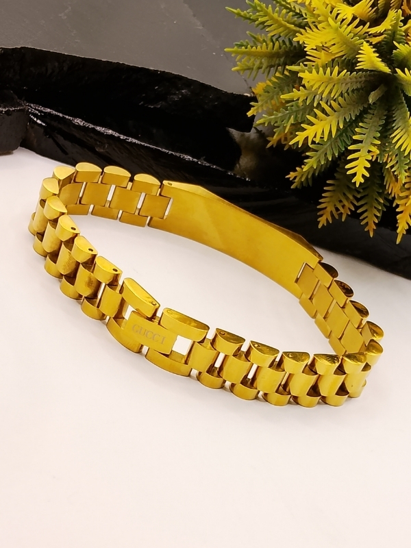 Design & Craftsmanship The bracelet features a sturdy, wide link chain with a rich, high-shine gold finish. The prominent center plate is beautifully engraved with the Gucci-style GG logo and set with four sparkling CZ stones. Crafted from high-grade stainless steel with premium gold plating that delivers a mirror-like finish and excellent durability.