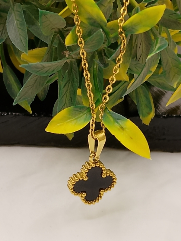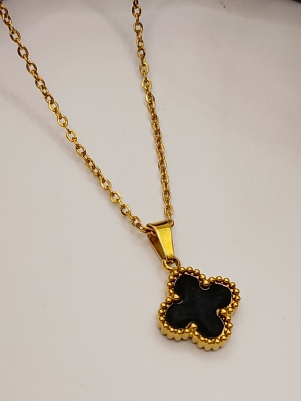 This stylish gold-plated pendant necklace for women showcases a classic four-leaf clover design in rich black color with a sparkling gold beaded border. The clover pendant is a popular symbol of luck and positivity. Its simple yet elegant look makes it suitable for both casual and formal wear.