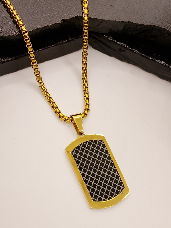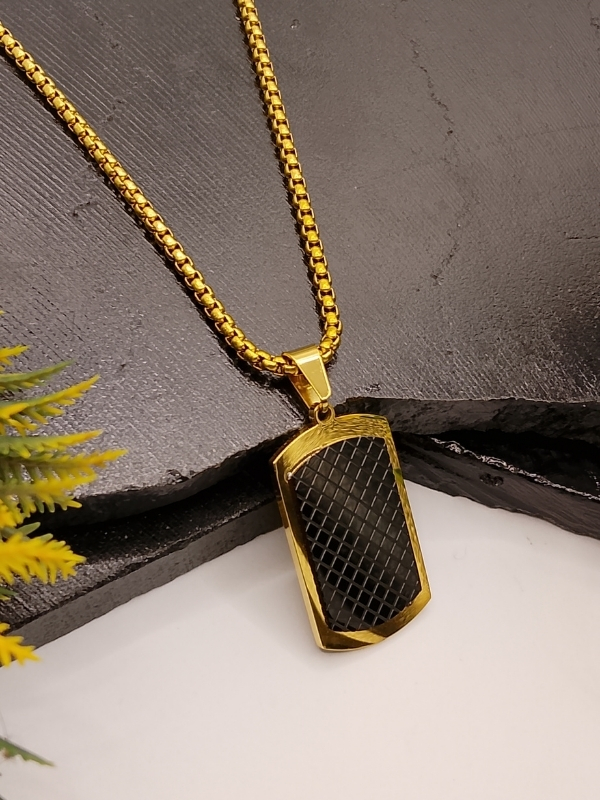 This luxury gold pendant necklace is designed for the modern man who loves bold and contemporary style. The striking rectangular pendant showcases a sleek black carbon fiber mesh center that creates a beautiful contrast against the bright gold frame. Hanging on a sturdy box link chain, it delivers a confident, masculine, and fashionable statement suitable for daily use or special occasions.