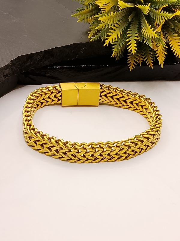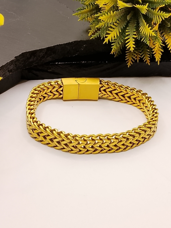 Watch-Style Link Chain: Ye bracelet kkaas tor par ghari (watch) ke patte (straps) se mutasir link design mein hai, jo aik heavy aur traditional look deta hai.