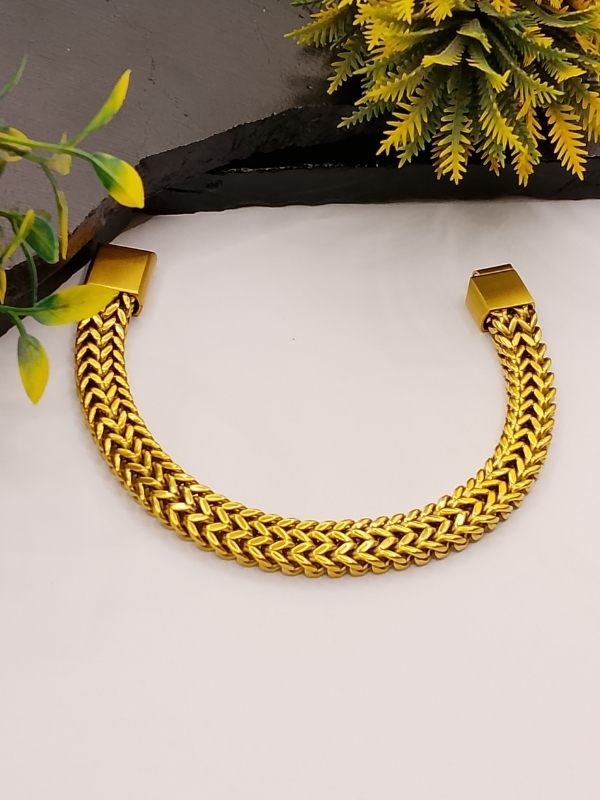 The bracelet features a wide, tightly woven chevron pattern with a rich, high-shine gold finish. It comes with a sturdy rectangular clasp for easy and secure wear. Crafted from high-quality alloy with premium gold plating that delivers a brilliant mirror-like shine.