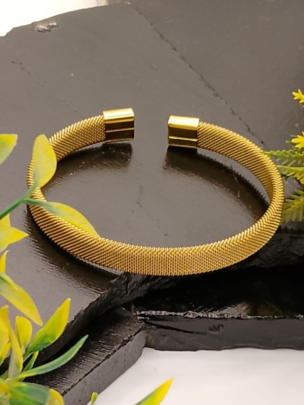 Elegant gold-plated mesh cuff bracelet featuring a fine, flexible woven mesh design with solid rectangular end caps and secure clasp. This premium openable bangle offers a modern, lightweight feel with brilliant high-shine gold finish, perfect for everyday luxury and stylish layering.
