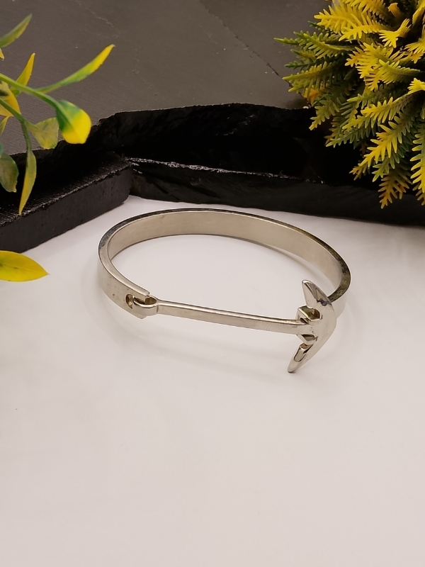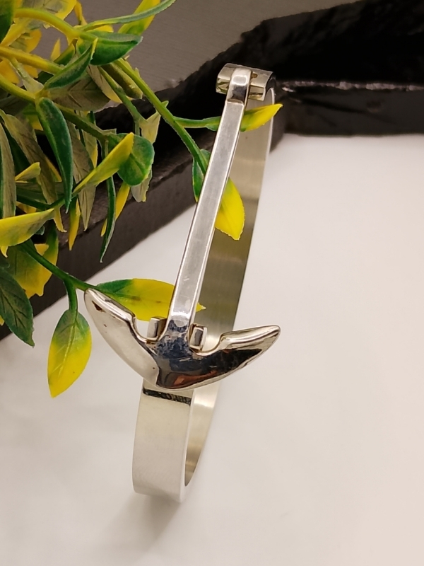 Expertly designed as an openable hinge cuff bangle, this bracelet features a thick, sturdy band with a prominent anchor shape integrated into the design. The high-quality alloy base is coated with premium silver plating that gives a luxurious, reflective finish. Smooth edges and precise craftsmanship ensure comfortable daily wear while maintaining a strong and durable structure.