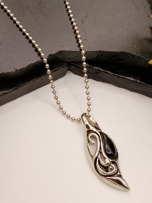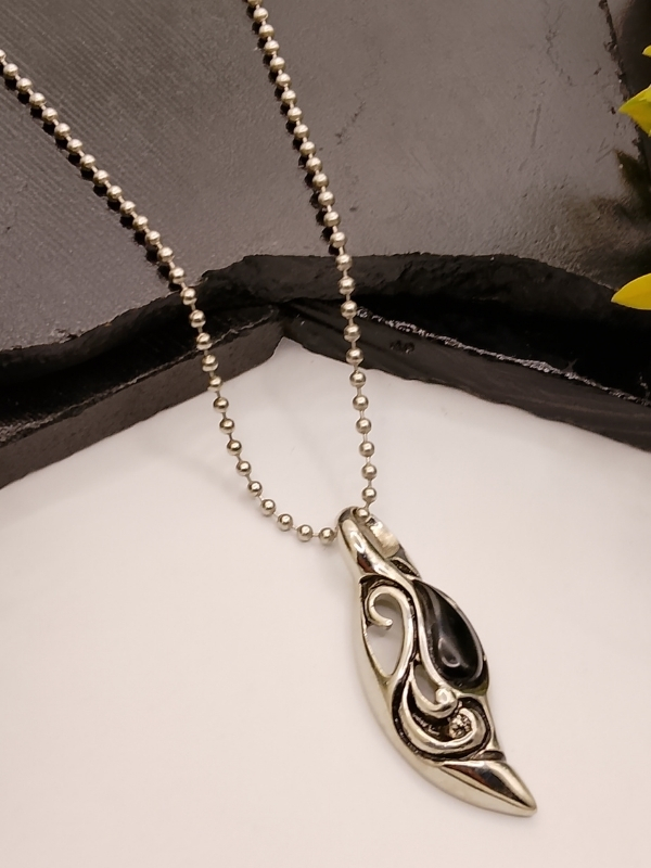 Silver Black Stone Pendant Necklace for Men – Stylish Leaf Shape with Swirl Design on Ball Chain
