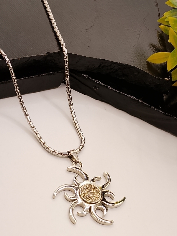 This stylish men’s silver pendant necklace showcases a radiant sun design with multiple curved rays and a shining golden center. The center is beautifully adorned with sparkling CZ stones that catch the light with every movement. Paired with a strong box chain, it offers a bold, energetic, and modern look suitable for daily wear or special occasions.