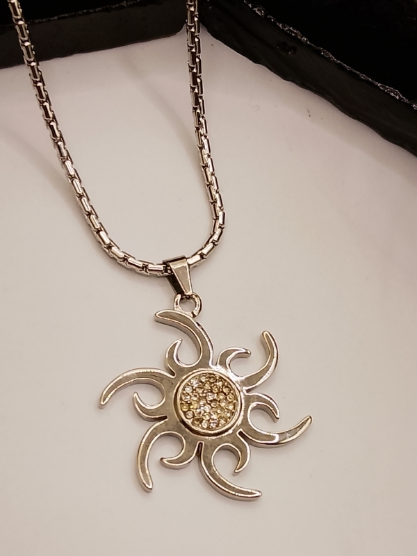 Eye-catching silver necklace featuring a bold sunburst pendant with radiating rays and a central golden circle filled with sparkling CZ stones. The two-tone silver and gold look gives it a premium and vibrant appeal. Comes on a sturdy box link chain, perfect for adding a bright and masculine touch to any outfit.